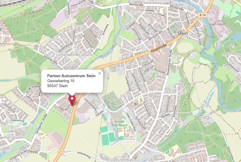 Wir befinden uns auf dem Gelände des Autozentrum Stein im Gewerbegebiet (Gewerbering 16, 90547 Stein). Der Standort ist ideal erreichbar aus Oberasbach, Zirndorf, Eibach, Gerasmühle und Nürnberg-Röthenbach.